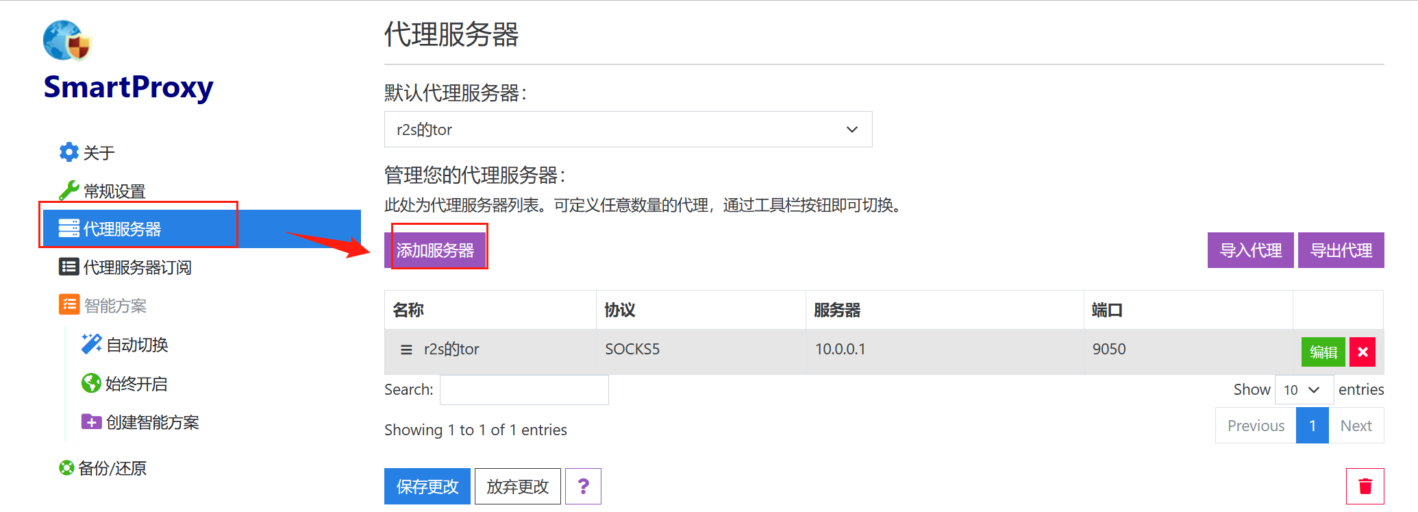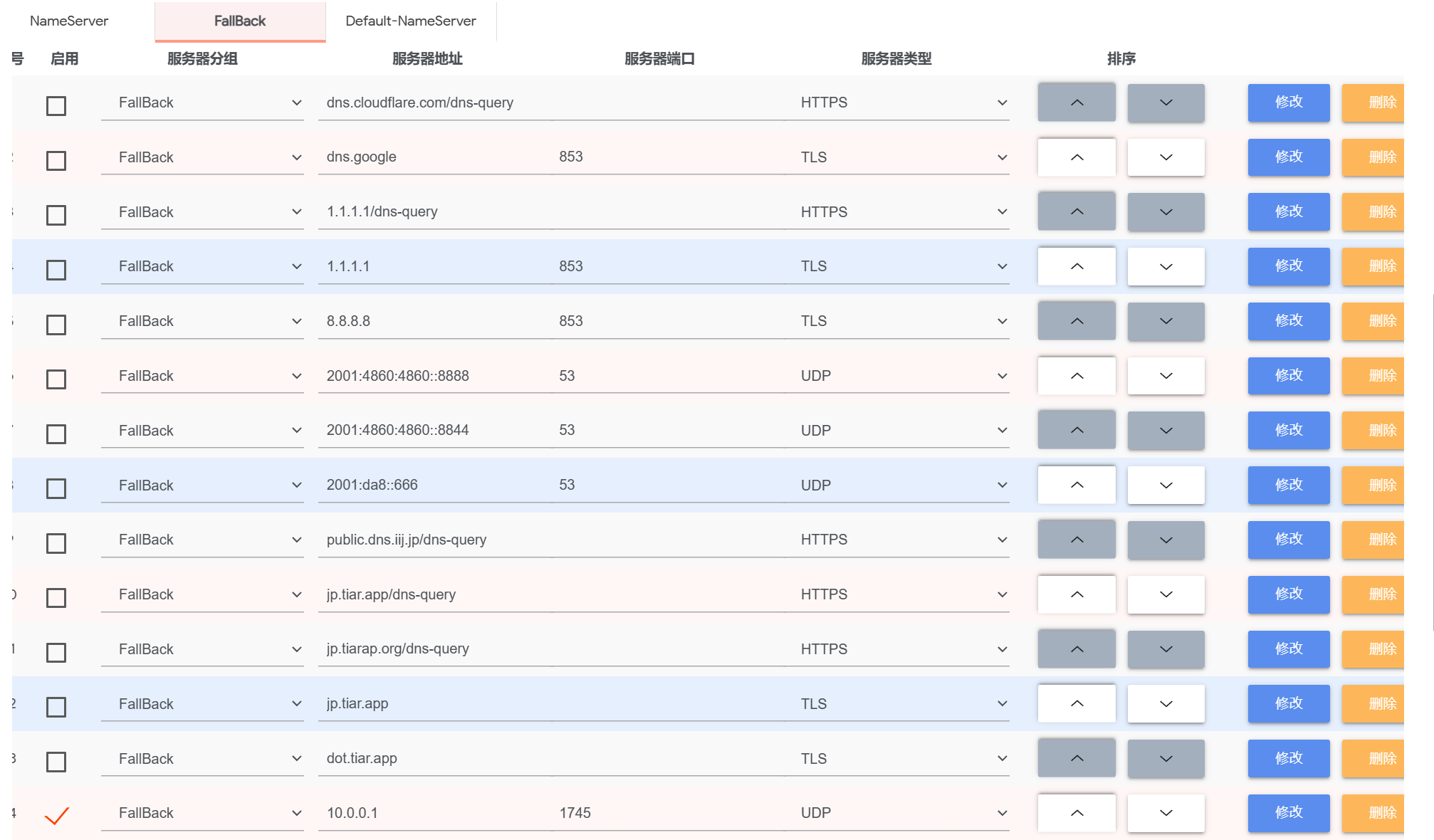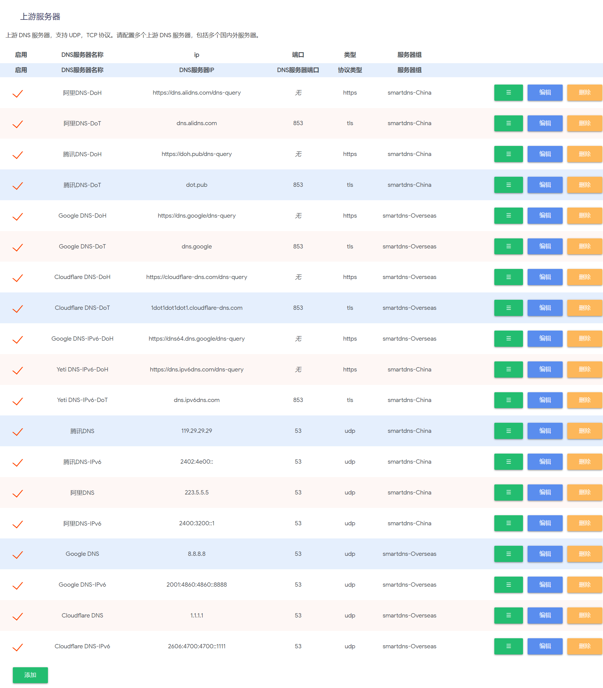 添加上游服务器如下,下面两个表都填写保存后,挨个点击每条后面的【编辑】修改组名,国内对应【China】国外对应【Overseas】,之后保存并应用;
