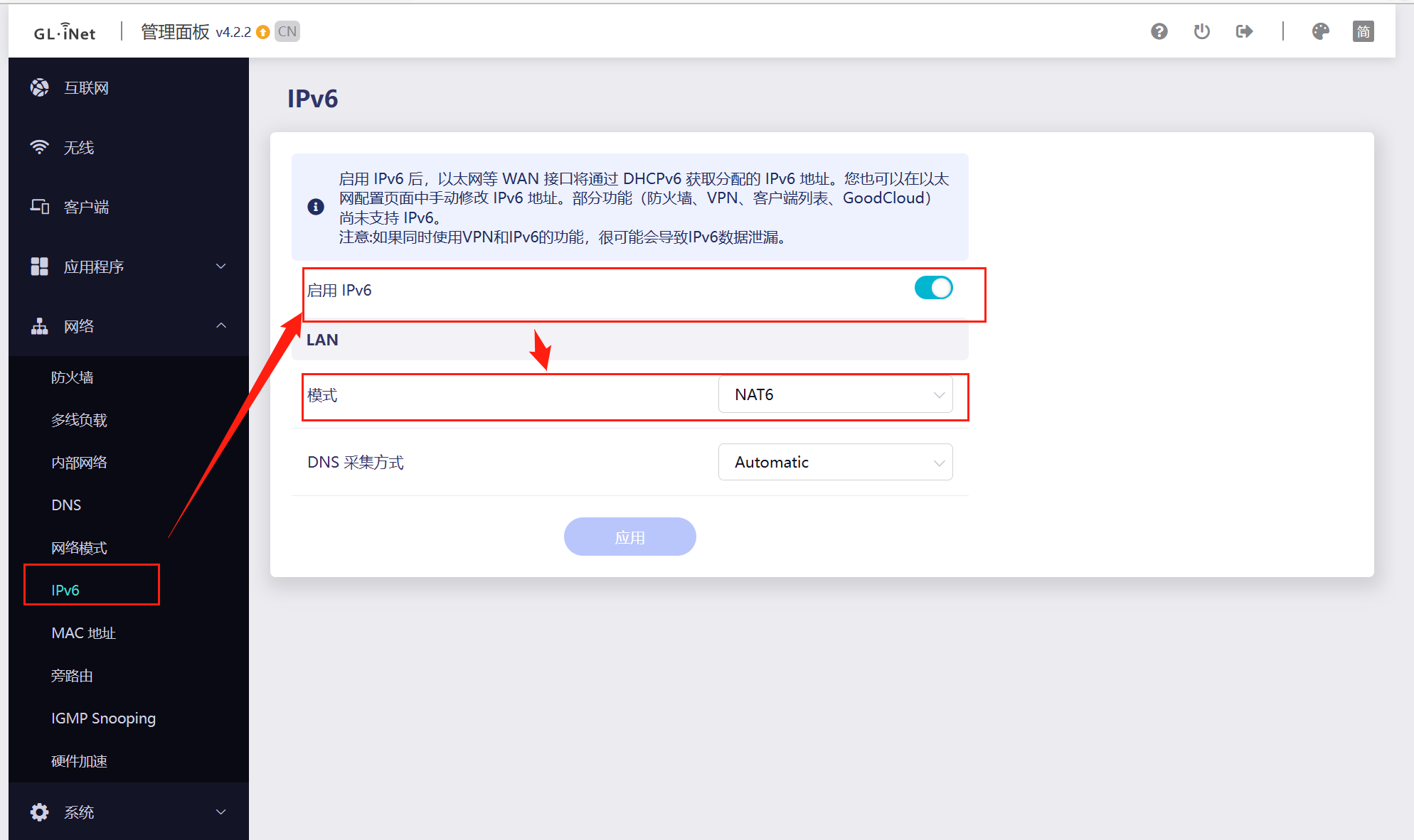 在路由器自身能够访问ipv6后,我们要解决因为地址不足造成内网设置无法访问ipv6的问题