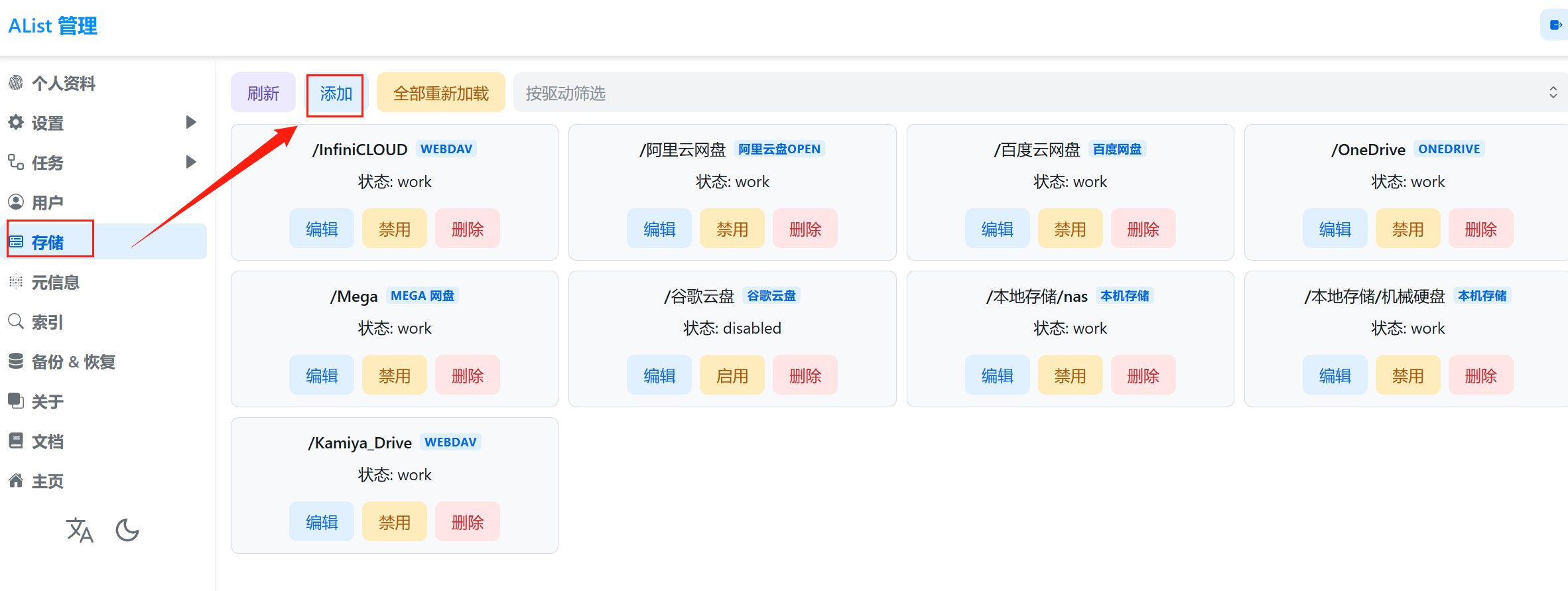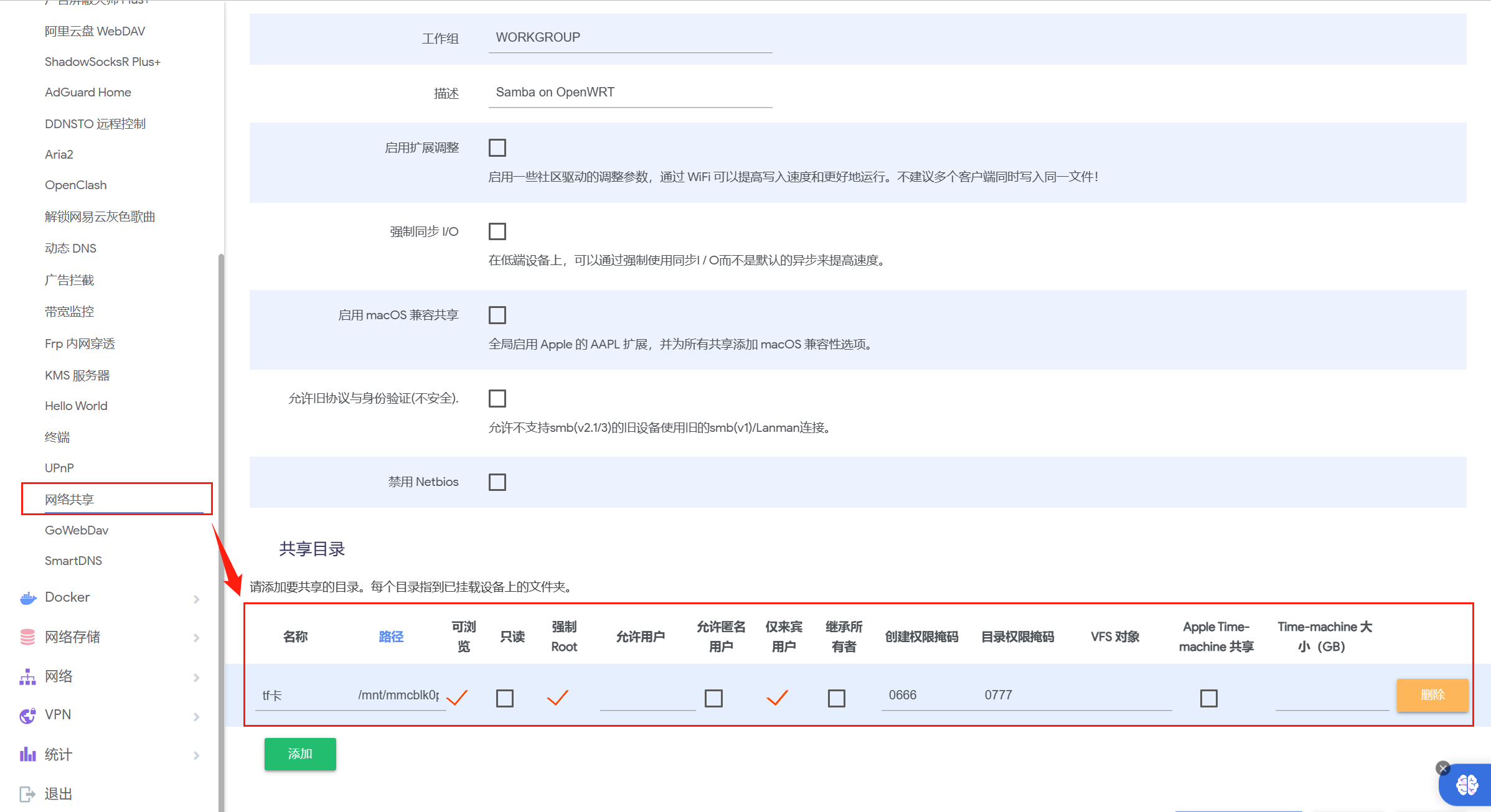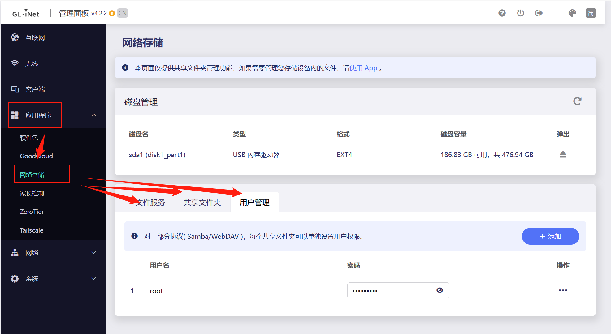 先在下图确认磁盘管理里面是否能找到硬盘,然后在用户管理里面添加一个用户(这是给samba用的),在共享文件夹中选择文件夹,最后在文件服务选择协议和端口,点击应用就完成了