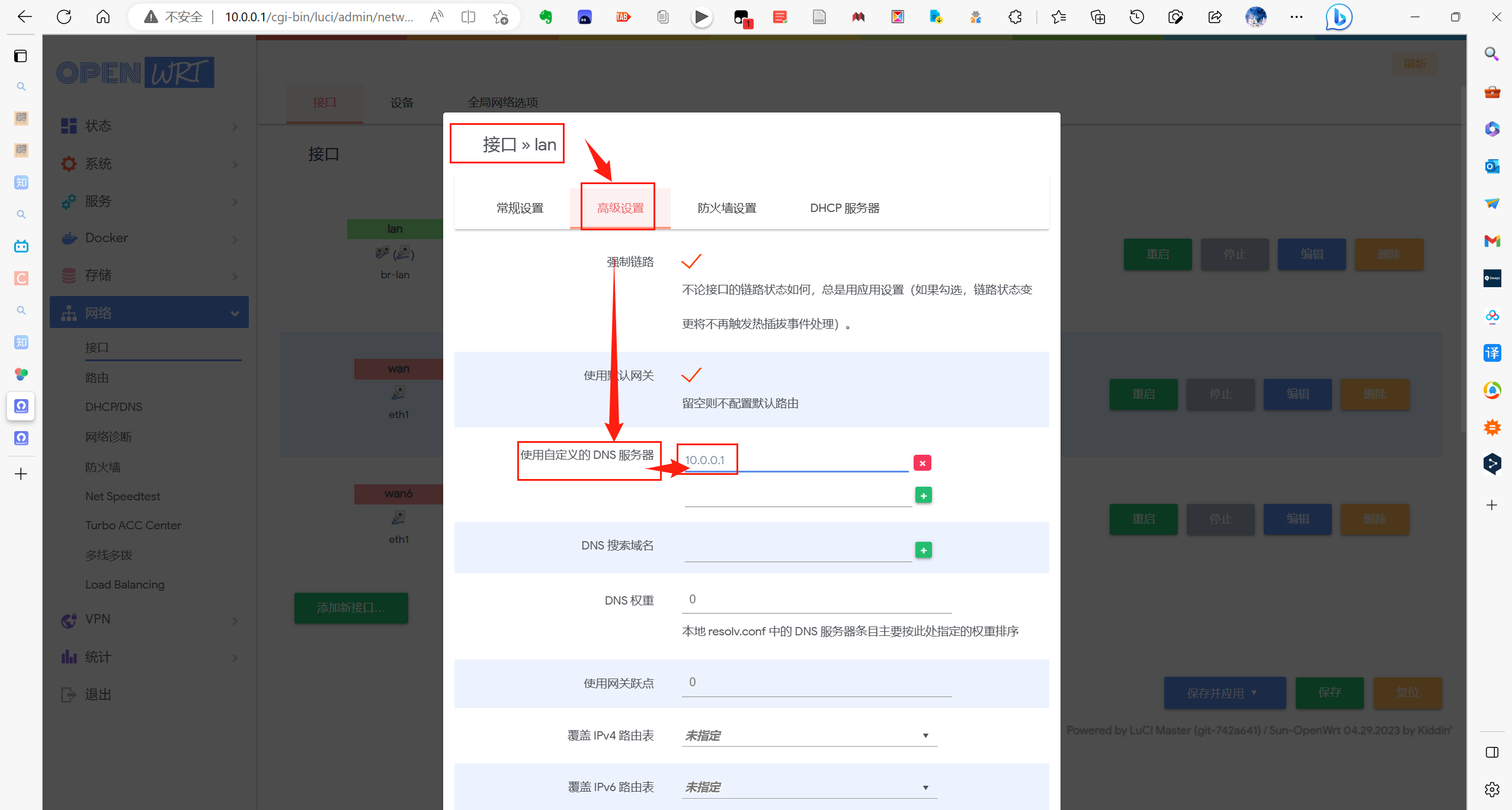 网络-接口界面设置Lan口,使用自定义的DNS服务器,地址为访问 openwrt 的ip(后台地址)