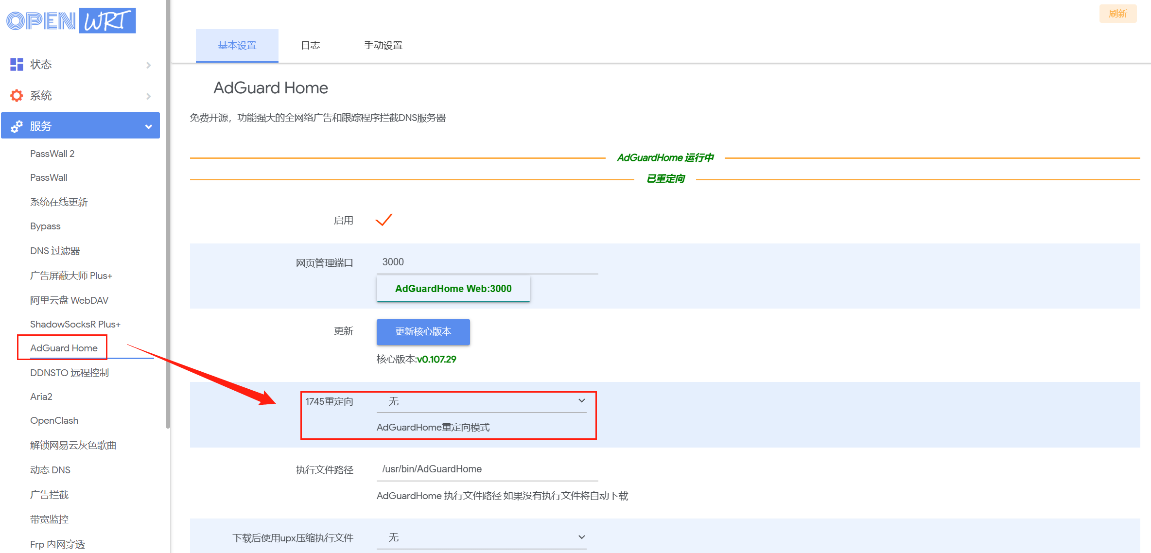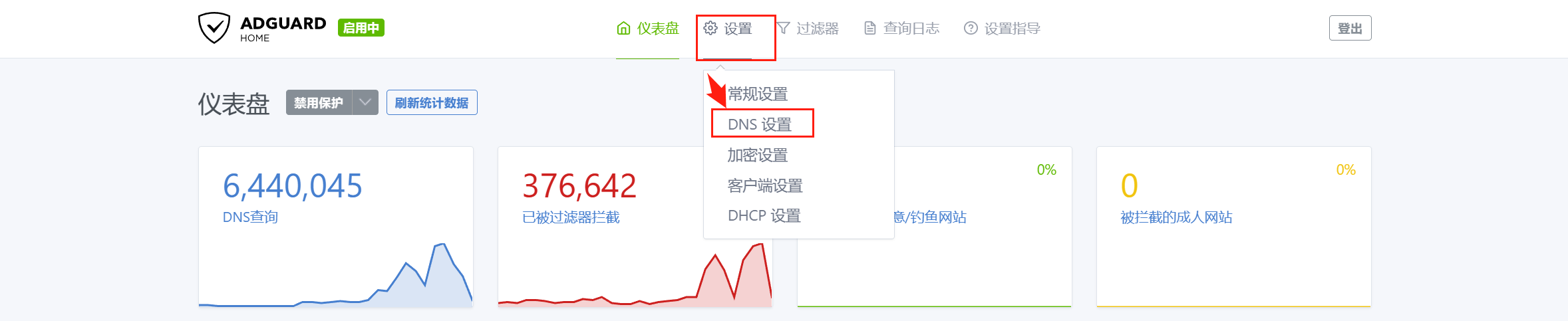 打开3000端口的Adguard Home网页管理界面,进入DNS设置