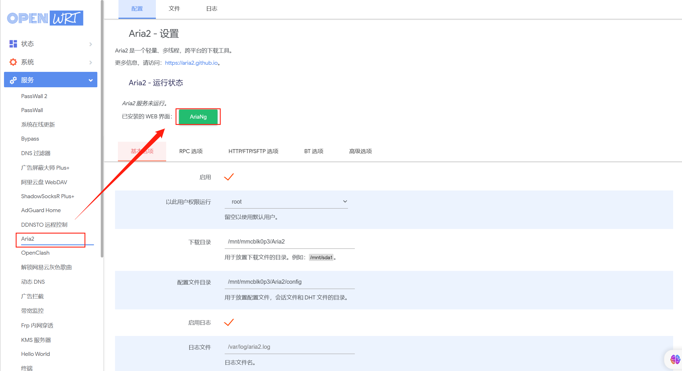 下载目录我设置为/mnt/mmcblk0p3/Aria2,我把配置文件存放在/mnt/mmcblk0p3/Aria2/config/aria2.conf.main
