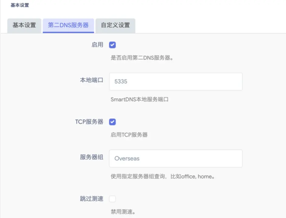 第二组设置,建议名称【Overseas】默认端口5335,勾选-TCP服务器、跳过测速、跳过双栈优选、跳过cache;