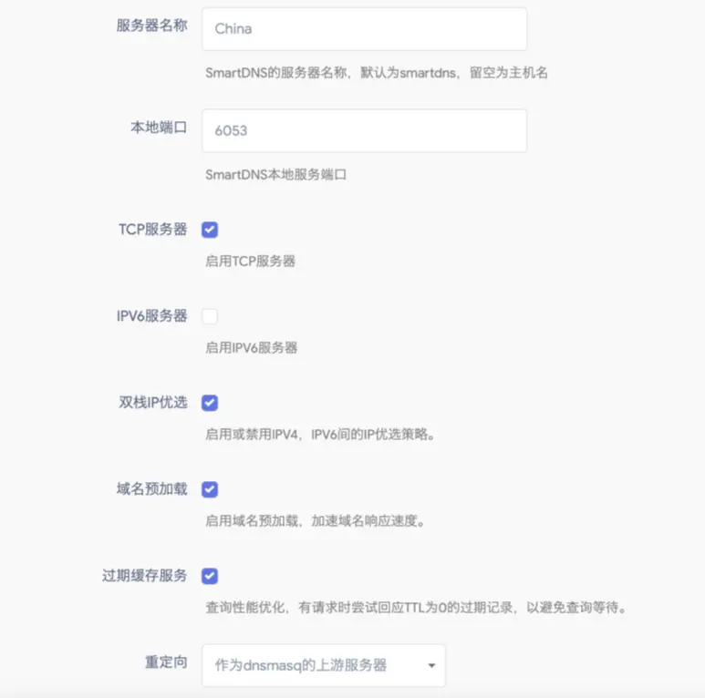 以下内容分为两部分设置,分别是【国内组】&【国外组】;第一组设置,建议名称为:【China】,默认端口6053,重定向选择【替换dnsmap上游服务器】,开启【双栈IP优选】、开启【TCP服务器】、开启【域名预加载】、开启【过期缓存服务】、缓存大小可设置【2048】、域名TTL为空、最小值默认300、最大值为3600或为空,然后保存;